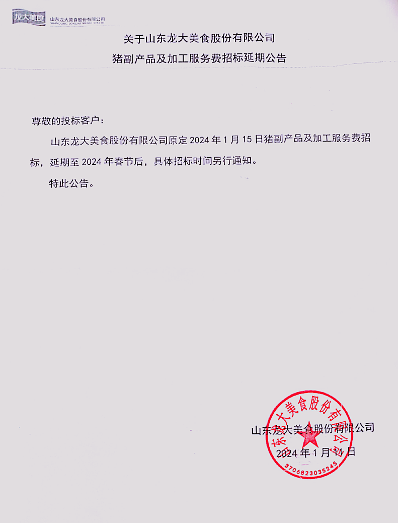 尊龙凯时原定2024年1月15日猪副产品及加工服务费招标,延期至2024年春节后,详细招标时间另行通知。
